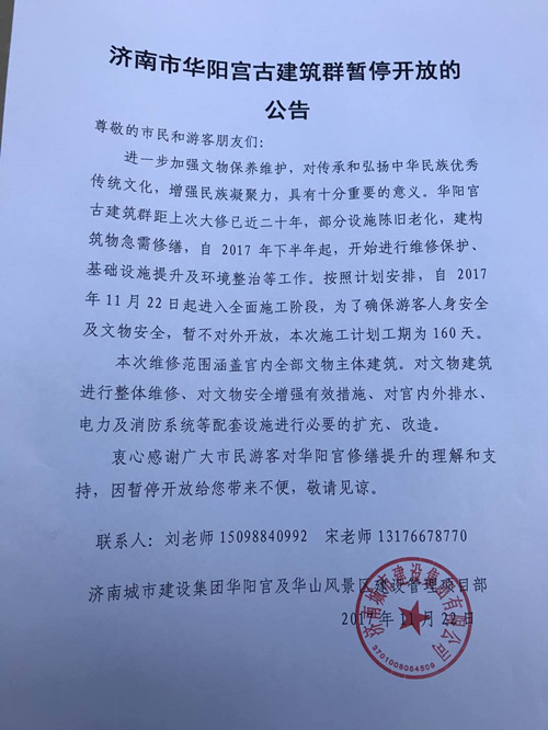 11月22日,因華陽宮古建筑群部分設(shè)施陳舊老化,建構(gòu)筑物急需修繕,即日起進(jìn)入全面施工修復(fù)階段。濟(jì)南城市建設(shè)集團(tuán)華陽宮及華山風(fēng)景區(qū)建設(shè)管理項(xiàng)目部發(fā)布濟(jì)南市華陽宮古建筑群暫停開放的公告。