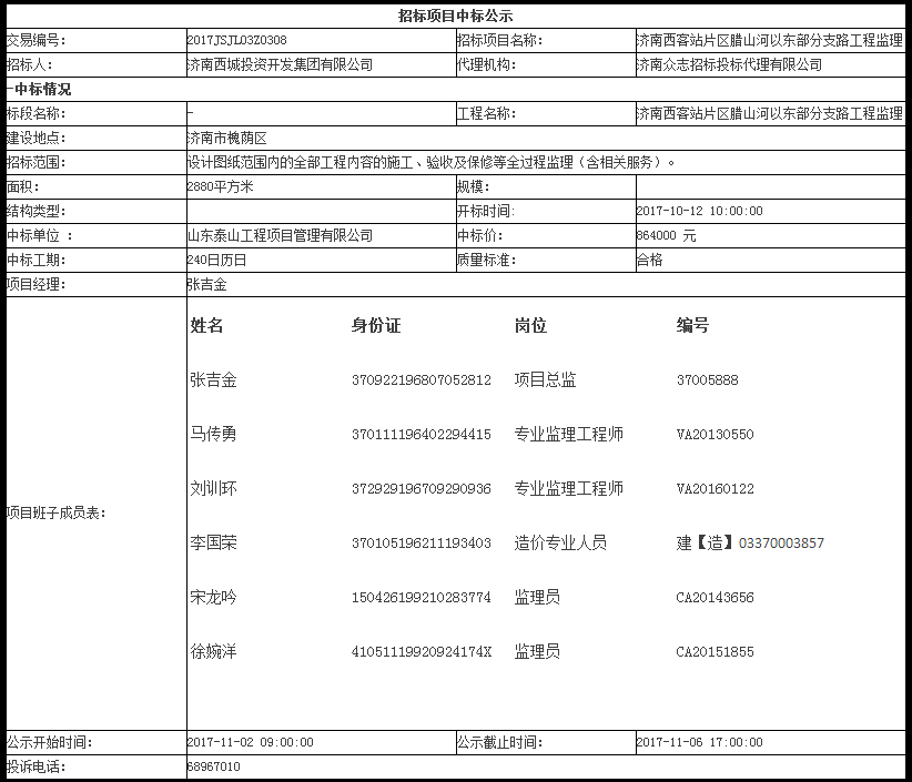 濟南西客站片區(qū)臘山河以東部分支路工程監(jiān)理中標公示