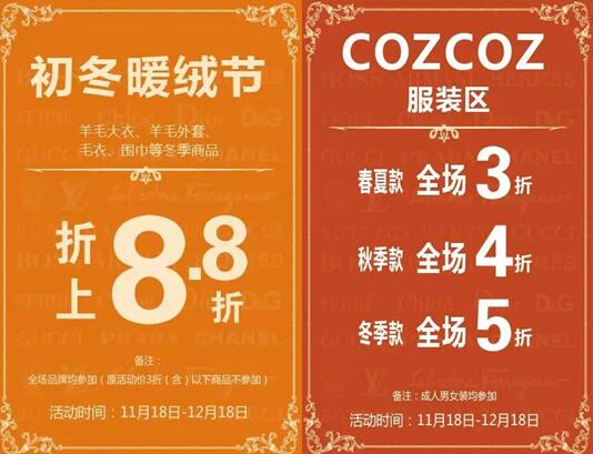 11月18日—12月18日推出“初冬暖絨節(jié)”活動,羊毛大衣、羊毛外套、毛衣、圍巾等冬季商品折上8.8折優(yōu)惠,cozcoz服裝區(qū)3~5折優(yōu)惠進(jìn)行中。