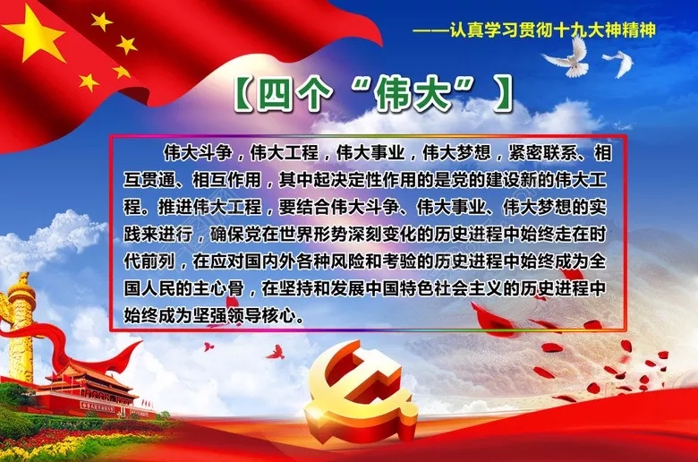 黨的十九大修改黨章明確把統(tǒng)攬“四個偉大”寫了進來,“四個偉大”指的是進行偉大斗爭、建設偉大工程、推進偉大事業(yè)、實現偉大夢想。