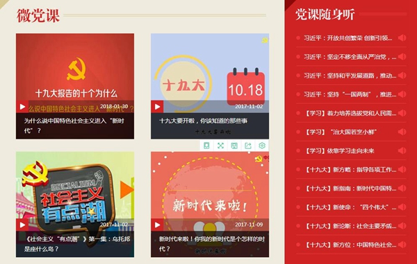 《十九大報(bào)告的十個(gè)為什么》、《社會(huì)主義有點(diǎn)潮》、《給90后講講馬克思》、《馬克思是對(duì)的》、《我是共產(chǎn)黨員》……“云黨課”學(xué)習(xí)平臺(tái)目前重點(diǎn)收錄了十九大精神系列解讀、最新最潮的系列微視頻、以及我黨十八大以來的黨建工作、治國(guó)理政等相關(guān)黨課學(xué)習(xí)視頻課程共計(jì)200余部,涵蓋黨建、政治、經(jīng)濟(jì)、文化、社會(huì)、外交等各個(gè)領(lǐng)域。平臺(tái)主要分為三大板塊:微黨課、黨課隨身聽、黨報(bào)天天讀,兼容PC端與手機(jī)端,方便廣大黨員干部及群眾多視角、多形式學(xué)習(xí)黨課內(nèi)容。