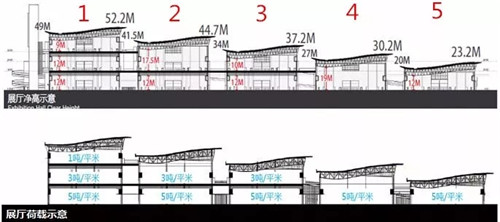 五個展館通過共享大廳彼此相連,共計展廳9個(161.2m*70.8m),布置標準展位共計5468個(標準展位3m*3m)。首層展廳地面承載5噸/平方米,凈高度12~19米;二樓展廳樓面承載3噸/平方米,凈高度10~17.5米;三樓展廳地面承載1噸/平方米,凈高度10米。