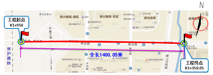 其中,京滬高鐵正線以東至臘山河以西標(biāo)段,全長1400.05米。主要施工內(nèi)容包括標(biāo)段范圍內(nèi)新建高架快速路、地面快速路、地面道路及橋梁、立交工程,敷設(shè)雨污水管線,配套實(shí)施給水、燃?xì)?、電力、熱力、電信、弱電、中水等管線土建工程,同步進(jìn)行綠化、照明、交通設(shè)施、河道整治、人行過街及海綿城市設(shè)施等建設(shè)。