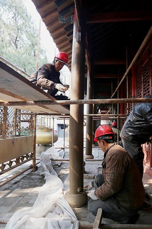 在現(xiàn)場(chǎng)可以看到,冬季過(guò)后,“修煉內(nèi)功”的綜合管線敷設(shè)、地形塑造、受損的磚作石作木作基底清理工作已基本完成,“濕作業(yè)”階段已經(jīng)全面展開(kāi)。目前正在進(jìn)行中的主要工作為建筑屋面的修繕,建筑墻體的修補(bǔ),路面、石階、古磚的清理修復(fù),建筑木構(gòu)件的砍活與重新上漆,木構(gòu)件表面彩繪的清理除塵等工作。