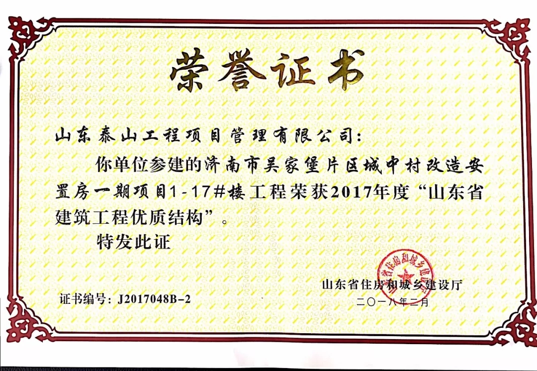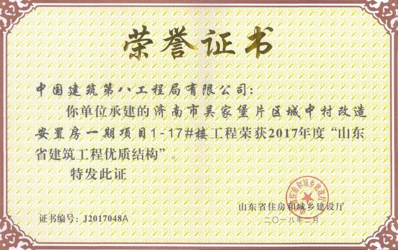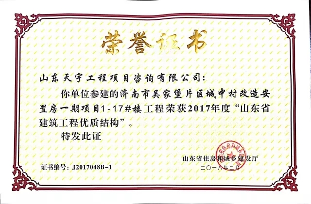 質(zhì)量是企業(yè)的生命。在山東省住房和城鄉(xiāng)建設(shè)廳組織的2017年度“山東省建筑工程優(yōu)質(zhì)結(jié)構(gòu)”評審中,吳家堡片區(qū)安置房一期工程1#到17#樓(共計17棟樓),憑借過硬的質(zhì)量、完善的管理順利通過專家考評,喜獲“山東省建筑工程優(yōu)質(zhì)結(jié)構(gòu)”。“山東省建筑工程優(yōu)質(zhì)結(jié)構(gòu)”代表著全省各建筑企業(yè)施工質(zhì)量管理的領(lǐng)先水平,為沖刺山東省建筑工程質(zhì)量最高榮譽(yù)“泰山杯”奠定了基礎(chǔ)。