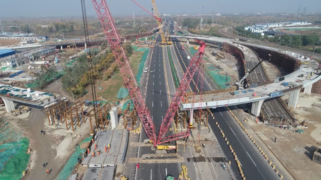 跨京臺高速鋼箱梁吊裝是整個工程極為關(guān)鍵的節(jié)點(diǎn),吊裝段位于跨京臺高速的南北兩處匝道,分別長54米和60米,每段重達(dá)170余噸,起吊噸位大,施工過程需克服跨京臺高速、高空作業(yè)等不利因素,城建集團(tuán)周密籌劃、科學(xué)組織,先后5次邀請行業(yè)內(nèi)專家召開專項(xiàng)論證會,最終確定“單向封閉,兩匝道同時(shí)吊裝”方案,加大人、機(jī)、物投入,把整個作業(yè)時(shí)間由計(jì)劃5個半小時(shí)縮短至不到4小時(shí),將高速通行影響降到最低,為工程節(jié)約了5天寶貴時(shí)間,為項(xiàng)目通車奠定堅(jiān)實(shí)基礎(chǔ)。