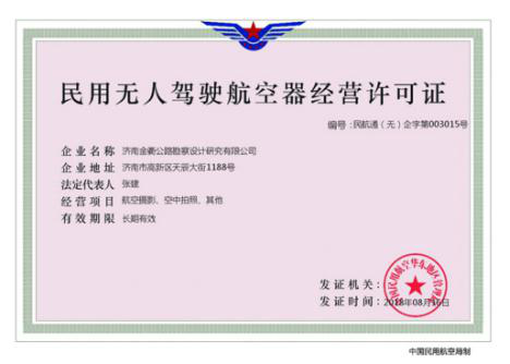 根據(jù)民航部門(mén)頒布的《民用無(wú)人駕駛航空器經(jīng)營(yíng)性飛行活動(dòng)管理辦法》及《無(wú)人機(jī)駕駛航空器飛行管理暫行條例》規(guī)定,濟(jì)南金衢公路勘察設(shè)計(jì)研究有限公司即刻選派人員參加無(wú)人機(jī)駕駛員培訓(xùn),于2018年8月16日獲得“中國(guó)民用航空華東地區(qū)管理局頒發(fā)的《民用無(wú)人駕駛航空器經(jīng)營(yíng)許可證》”,公司員工李波同志獲得民用無(wú)人機(jī)駕駛員合格證和無(wú)人機(jī)超視距駕駛員合格證。