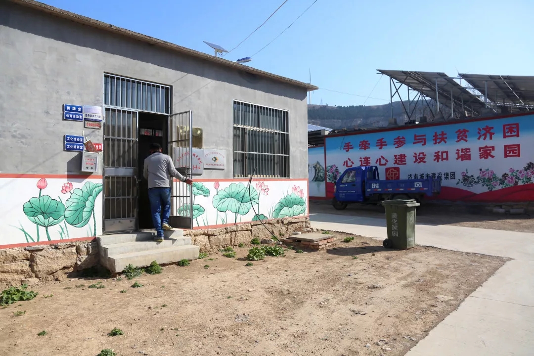 11:00王棟棟來(lái)到村里另一塊裸土覆綠的空地上,村民齊上陣,植樹(shù)工作已接近尾聲??盏乇M頭的文化墻,與遠(yuǎn)山近樹(shù)相映成趣。2017年,大黃崖村入選第四批省級(jí)傳統(tǒng)村落,王棟棟到村后,結(jié)合本村實(shí)際,在不破壞古村落的基礎(chǔ)上,在村民相對(duì)集中、顯眼的位置建設(shè)墻體文化,加大扶貧政策宣傳力度,傳遞國(guó)家政策方針,提升了村里文化氣息,極大的改善了村容村貌。