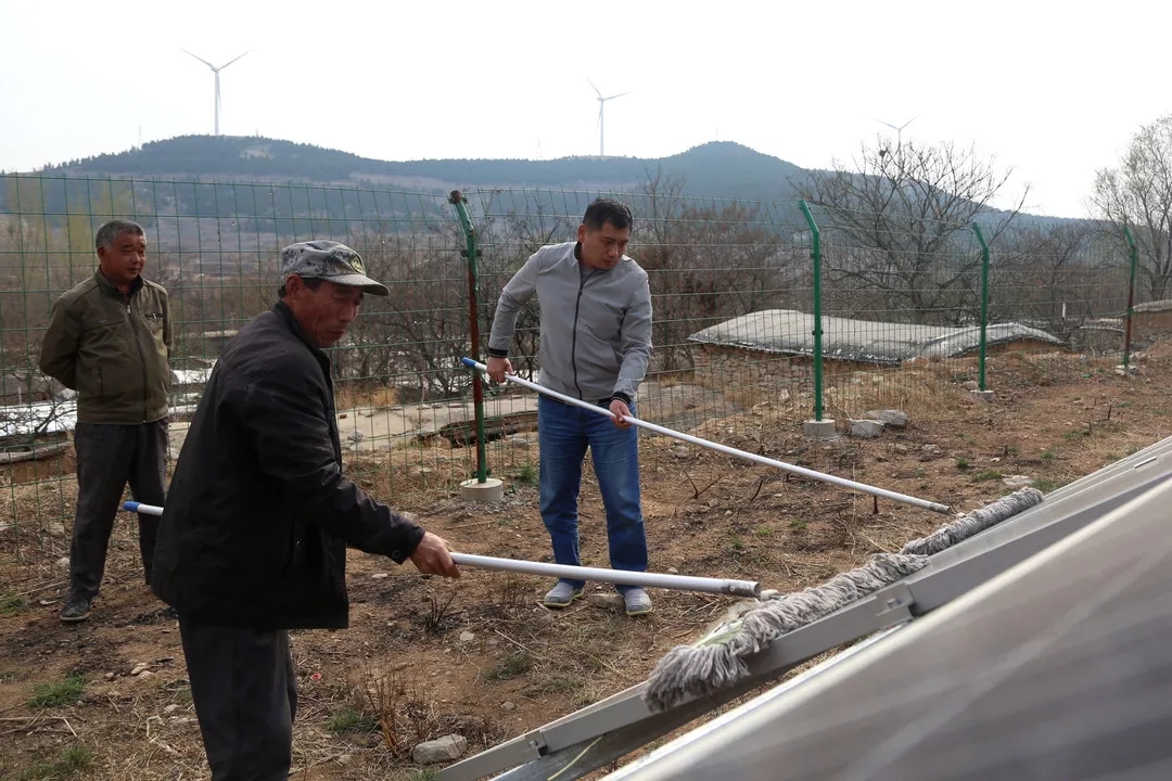 13:30沿著陡峭山路晚上走,王棟棟來(lái)到了村里的光伏發(fā)電項(xiàng)目,“有兩塊光伏板壞掉了,要及時(shí)向扶貧辦報(bào)修調(diào)換,不然會(huì)影響發(fā)電量”。王棟棟叮囑管理人員。報(bào)修完之后,王棟棟和維護(hù)人員一起對(duì)光伏板進(jìn)行擦洗維護(hù)。