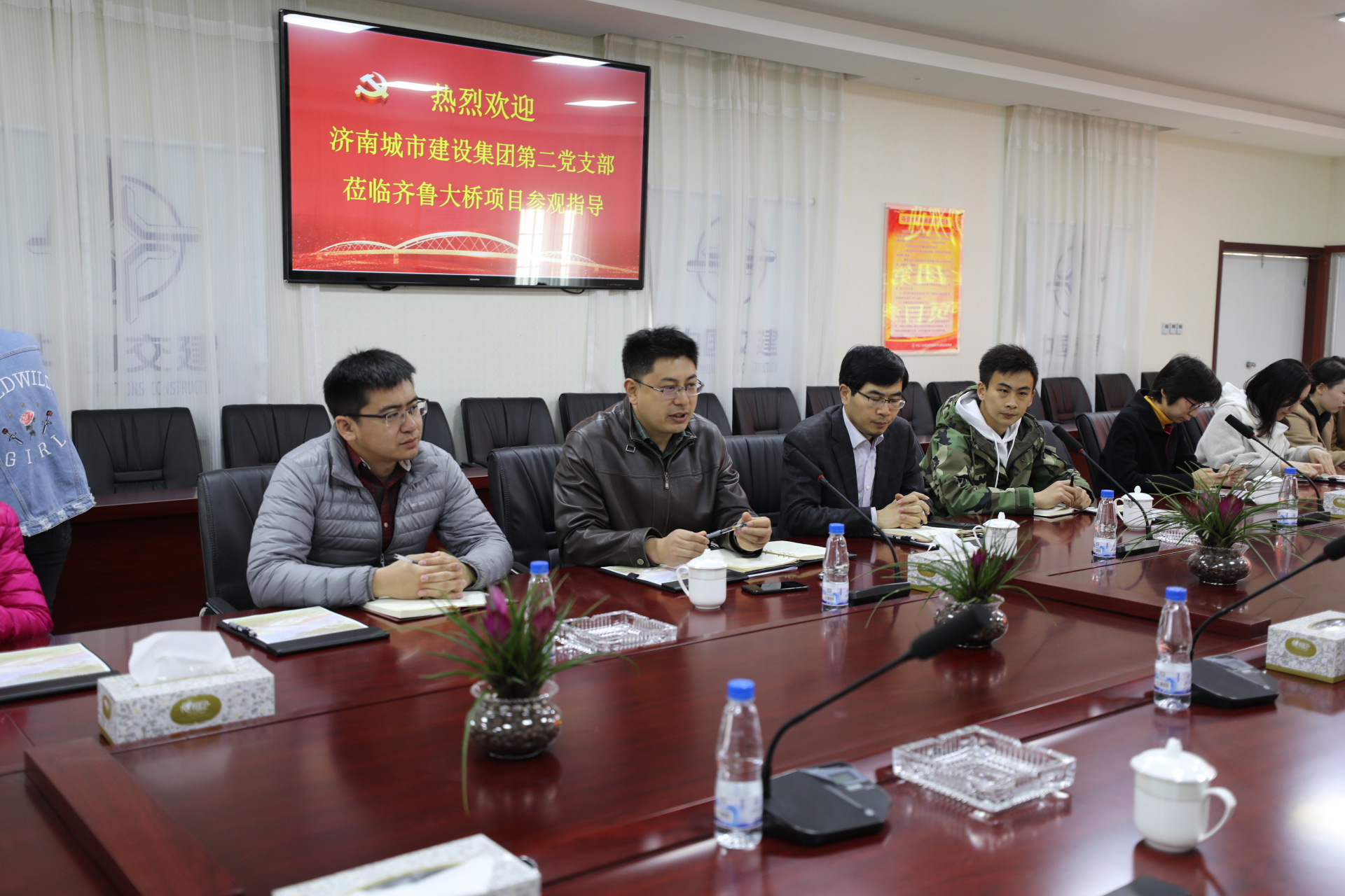 全體人員在集團(tuán)總會(huì)計(jì)師范天云的帶領(lǐng)下,首先來(lái)到齊魯大道北延工程項(xiàng)目經(jīng)理部,與公司副總經(jīng)理趙世超及工作人員進(jìn)行了座談,雙方首先介紹了各自支部情況及組織建設(shè)情況并進(jìn)行了交流。隨后,項(xiàng)目負(fù)責(zé)人對(duì)工程進(jìn)行了詳細(xì)的介紹,并參觀了齊魯黃河大橋橋梁模型、觀看了黃河大橋建設(shè)宣傳片,展示了齊魯黃河大橋的建設(shè)過程及原理。作為目前同類橋型跨徑世界第一網(wǎng)狀吊桿系桿拱橋,其所展現(xiàn)的創(chuàng)新技術(shù)、建成效果以及打造的“黃河橋梁文化”令人驚嘆和期待。