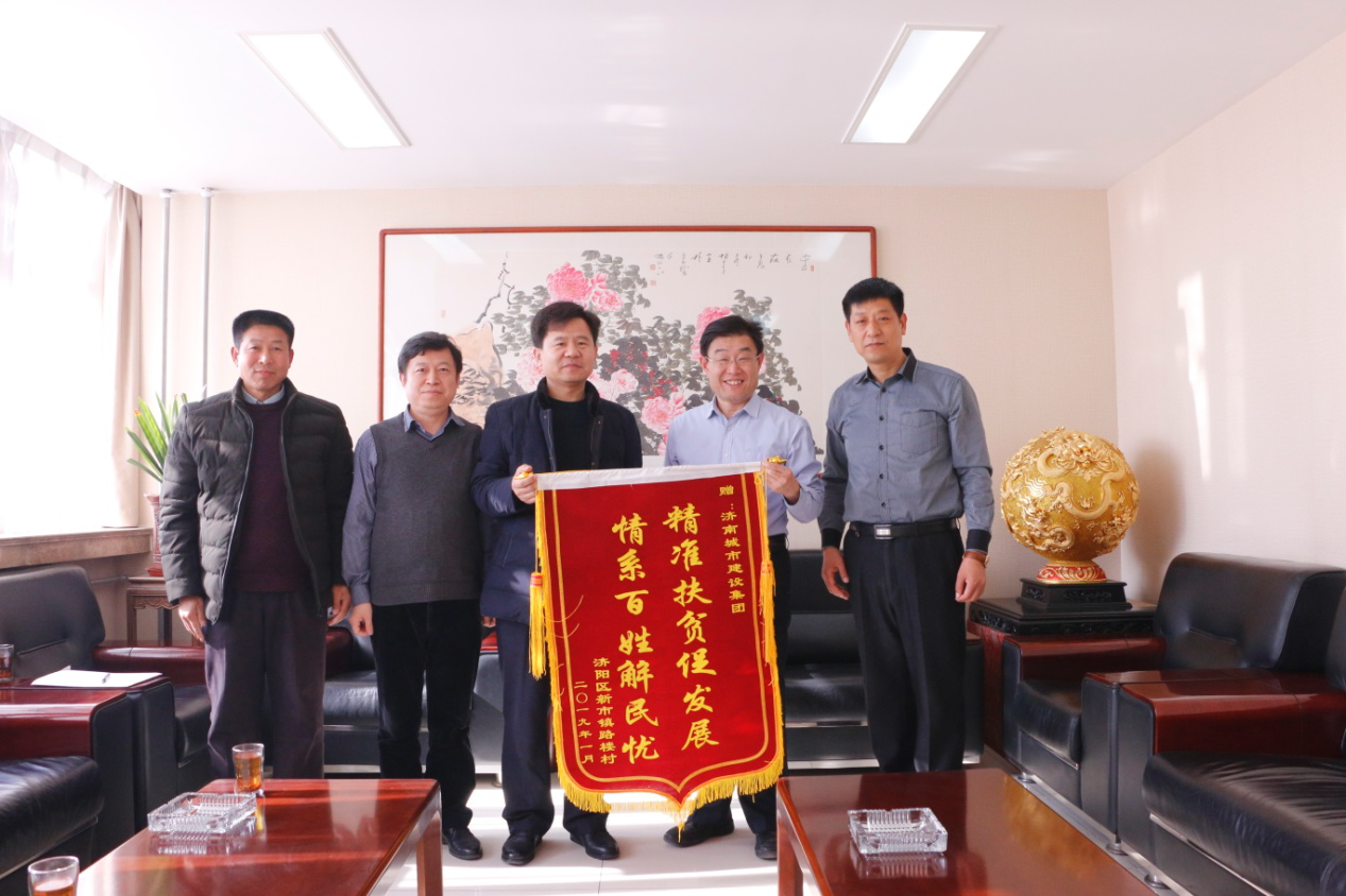 1月25日,濟(jì)陽(yáng)區(qū)新市鎮(zhèn)黨委副書記王勇、鎮(zhèn)扶貧辦主任劉俊青、路樓村支部書記路和勇、路樓村“第一書記”張慶紅一行到濟(jì)南城市建設(shè)集團(tuán)就幫扶工作進(jìn)行回訪,并為集團(tuán)送來(lái)錦旗,集團(tuán)副總經(jīng)理安玉坤、集團(tuán)辦公室副主任徐峰參加活動(dòng)。