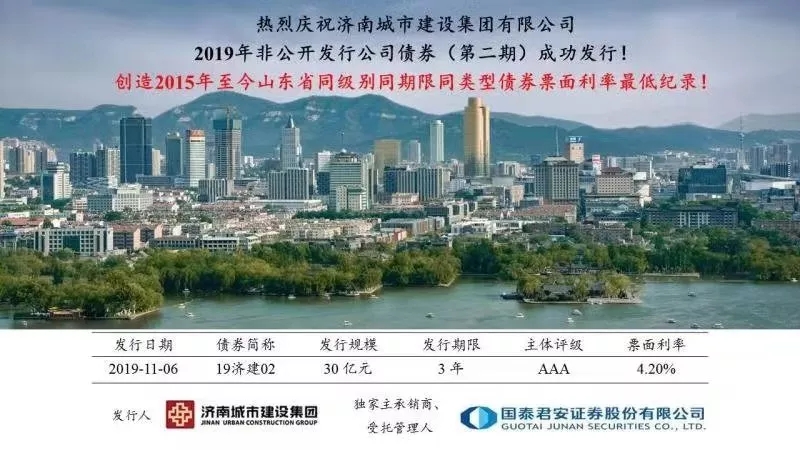 2019年11月6日,濟(jì)南城市建設(shè)集團(tuán)非公開(kāi)發(fā)行2019年公司債券(第二期)(“19濟(jì)建02”)發(fā)行圓滿落地,創(chuàng)造2015年至今山東省同級(jí)別同期限同類型債券票面利率最低紀(jì)錄。本期債券發(fā)行得到了市場(chǎng)的廣泛認(rèn)可,投資者認(rèn)購(gòu)踴躍。19濟(jì)建02低利率發(fā)行,充分展現(xiàn)了投資者對(duì)建設(shè)集團(tuán)領(lǐng)先的行業(yè)地位、良好的品牌形象以及穩(wěn)健的財(cái)務(wù)政策等方面的肯定。