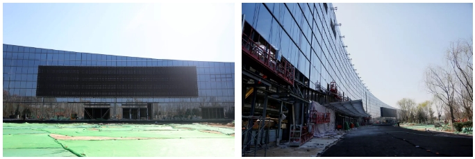 項(xiàng)目建成后,主入口位于展館西側(cè)的共享大廳,南北向的5個(gè)展館通過(guò)共享大廳相通,目前共享大廳的玻璃幕墻已安裝完畢,每塊玻璃都按照固定編號(hào)依次安裝,不同弧度的玻璃面完美拼接,將大廳的流動(dòng)設(shè)計(jì)感盡顯無(wú)疑。共享大廳外立面的LED大屏頗為搶眼,高約8米、長(zhǎng)約43米的LED大屏日后將用于不同展館布展介紹情況等宣傳使用。在室外部分,正在進(jìn)行廣場(chǎng)綠化和管道鋪設(shè)等施工,工人們有條不紊地完善著室外施工細(xì)節(jié)。