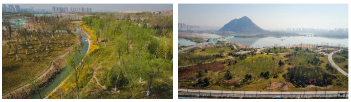 園區(qū)在設(shè)計建設(shè)時注重區(qū)分功能性和體驗性,華山北面部分定位為濕地展示區(qū),展示濕地的景觀特性,融合體驗式科教,綠化景觀多為豐富層疊狀,各類植物栽種交錯有致,層次豐富,移步至華山東面及東南面,這片區(qū)域定位為山林文娛區(qū),結(jié)合北臥牛山和驢山形成特色山林景觀,靠近山體部分的植物景觀結(jié)構(gòu)上則多以大開大合景觀為主,大片草地開闊寬廣,風格迥異,賞玩別有趣味。