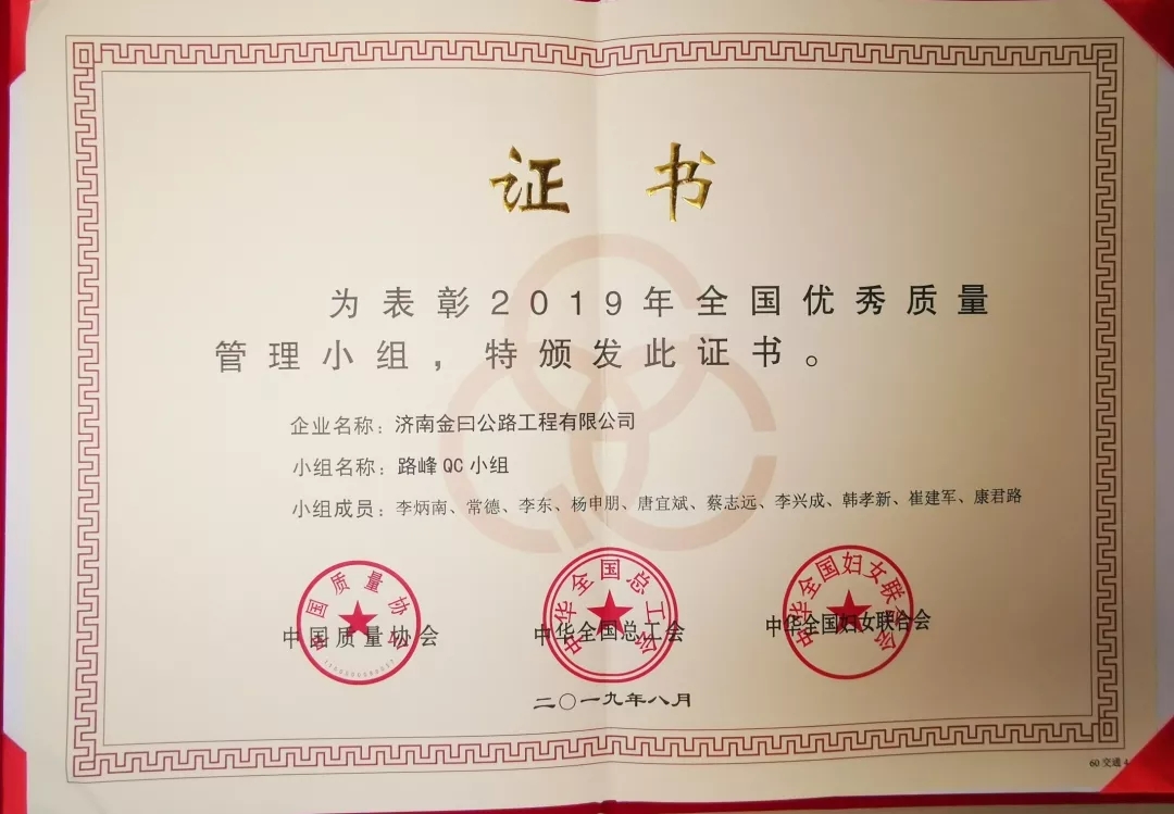 12月19日,2019年全國交通質(zhì)量年會在重慶召開,大會由中國交通企業(yè)管理協(xié)會主辦,以“共創(chuàng)交通質(zhì)量 建設(shè)建通強國”為主題,來自全國各地交通行業(yè)的代表參加了會議。濟南金曰公路工程有限公司路峰QC小組從全國交通系統(tǒng)600多個QC小組中脫穎而出,被評為全國優(yōu)秀質(zhì)量管理小組,成為全國交通行業(yè)五個全國優(yōu)秀管理小組中的一個。