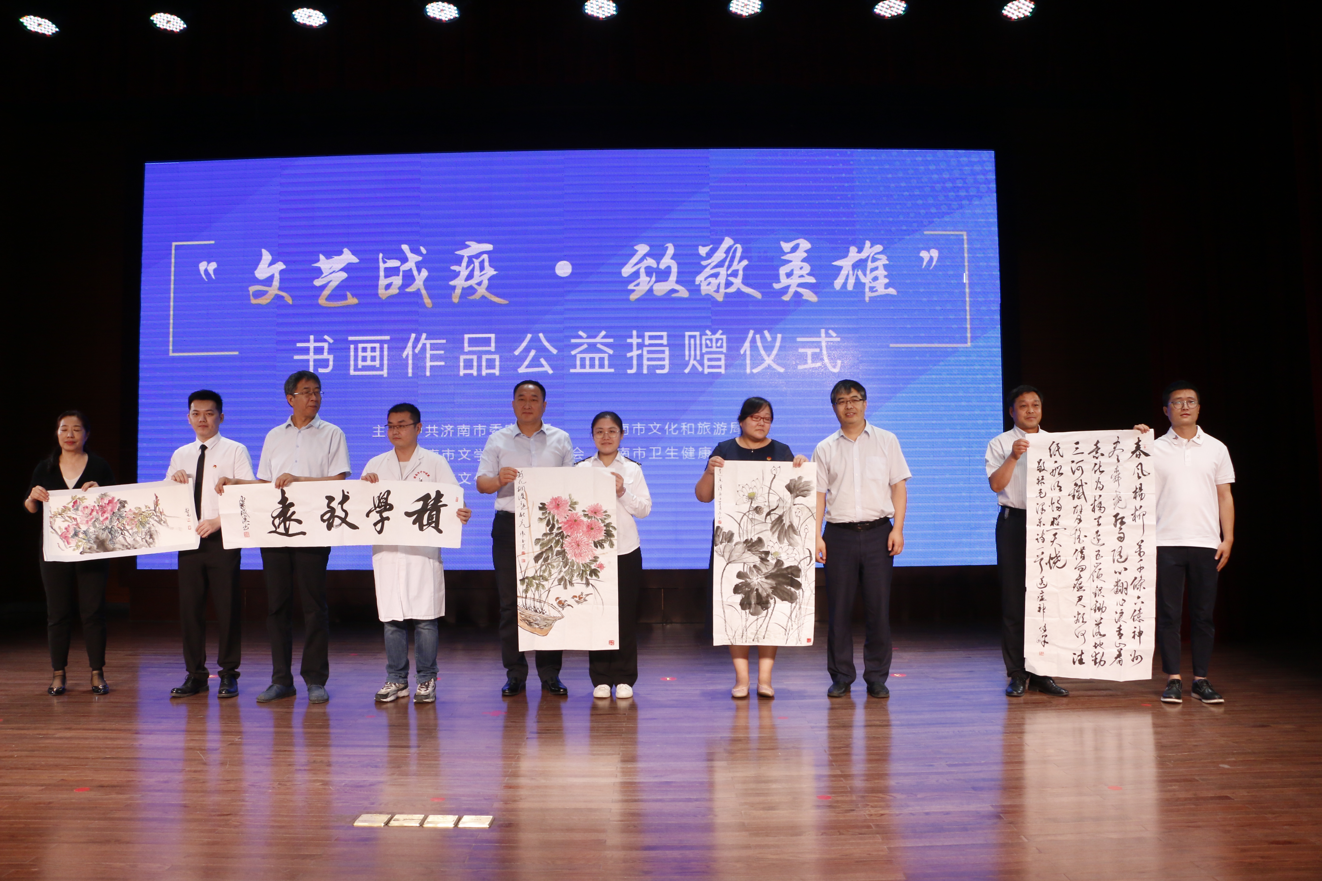 為進(jìn)一步加強(qiáng)疫情防控宣傳工作,充分發(fā)揮濟(jì)南市文藝戰(zhàn)線優(yōu)勢作用,用文藝的形式向抗擊疫情一線英雄致敬,6月9日,由市委宣傳部、市文化和旅游局、市文學(xué)藝術(shù)界聯(lián)合會、市衛(wèi)生健康委員會主辦,市文化館承辦的“文藝戰(zhàn)疫·致敬英雄”濟(jì)南市書畫作品公益捐贈儀式在市文化館多功能廳舉行。市委宣傳部、市文化和旅游局、市文聯(lián)、市衛(wèi)健委等主承辦單位相關(guān)負(fù)責(zé)同志以及書畫作品捐贈藝術(shù)家代表、援鄂醫(yī)護(hù)工作者等抗擊疫情一線的各界代表共計(jì)80余人參加活動。