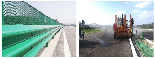 金宇公司在波形梁鋼護欄施工中,采用綠色環(huán)氧鋅基材料,以清潔能源生產替代傳統(tǒng)加熱方式,減少碳排放每噸護欄平均節(jié)煤100公斤,減排250公斤。在護欄立柱鉆孔施工中采取灑水降塵措施,嚴格做好環(huán)保工作。