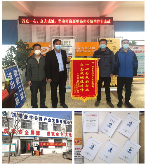 疫情來勢洶洶,在嚴峻條件下金曰公司、金宇公司等項目部主動出擊,儲備防疫物資,制作宣傳標語,協(xié)調人員調度,一手抓防疫,一手抓復工,堅持“兩手抓”,奪取“雙勝利”。金曰公司項目部為沿線的8個村莊和濟菏高速收費站捐獻了生活必需品、防疫物資,協(xié)助當?shù)劓?zhèn)政府開展疫情防控工作,積極承擔社會責任。