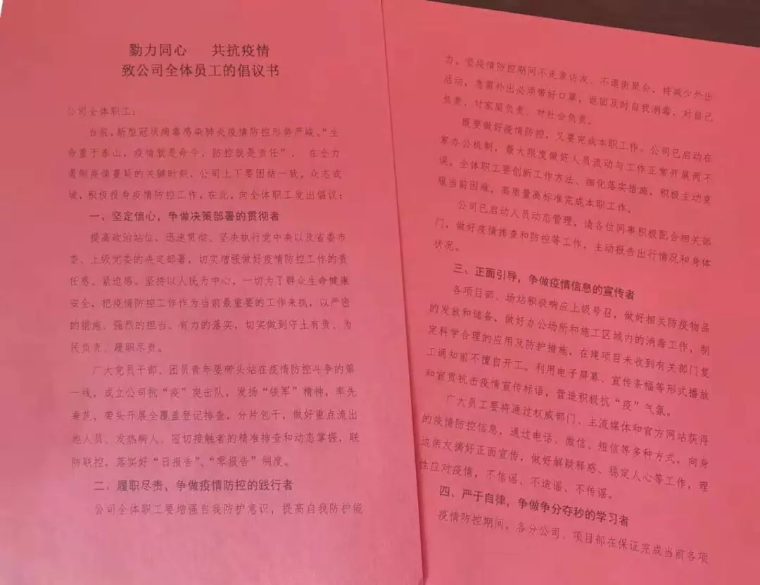 公司黨支部、團(tuán)支部向公司全體職工發(fā)出倡議,爭(zhēng)做決策部署的貫徹者、疫情防控的踐行者、疫情信息的宣傳者、時(shí)間管理的學(xué)習(xí)者,勠力同心,共抗疫情!