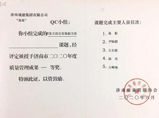 經(jīng)濟(jì)南質(zhì)量管理協(xié)會(huì)專家組評(píng)審,濟(jì)南城建集團(tuán)有限公司報(bào)送的QC成果榮獲一等獎(jiǎng)5項(xiàng)、二等獎(jiǎng)4項(xiàng),濟(jì)南城建集團(tuán)有限公司的城市隧道項(xiàng)目班組、701項(xiàng)目班組、盾構(gòu)施工管理班組、804項(xiàng)目班組等共有7個(gè)班組榮獲“2020年度濟(jì)南市質(zhì)量信得過班組”稱號(hào)。另外,張勝安等3名員工獲得“2020年度濟(jì)南市優(yōu)秀質(zhì)量管理先進(jìn)工作者”稱號(hào)。