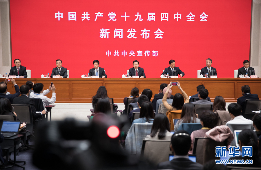 11月1日,中共中央宣傳部在北京舉行中國(guó)共產(chǎn)黨十九屆四中全會(huì)新聞發(fā)布會(huì),請(qǐng)中央宣傳部分管日常工作的副部長(zhǎng)、中央政策研究室副主任王曉暉,中央政策研究室分管日常工作的副主任江金權(quán),中央財(cái)經(jīng)委員會(huì)辦公室分管日常工作的副主任韓文秀,全國(guó)人大常委會(huì)法工委主任、港澳基本法委主任沈春耀,司法部黨組書(shū)記、副部長(zhǎng)袁曙宏,全國(guó)政協(xié)副秘書(shū)長(zhǎng)舒啟明介紹有關(guān)情況,并答記者問(wèn)。中央宣傳部副部長(zhǎng)、國(guó)務(wù)院新聞辦公室主任徐麟主持新聞發(fā)布會(huì)。新華社記者金立旺攝