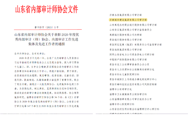 今年以來(lái),通過(guò)加快建章立制,明確規(guī)定了審計(jì)年度計(jì)劃制定、方案制定、證據(jù)收集、底稿日志編寫、報(bào)告質(zhì)量控制、檔案管理等全流程標(biāo)準(zhǔn),逐步形成了一整套行之有效的內(nèi)部審計(jì)制度體系,并榮獲“山東省內(nèi)部審計(jì)工作先進(jìn)單位”稱號(hào)。