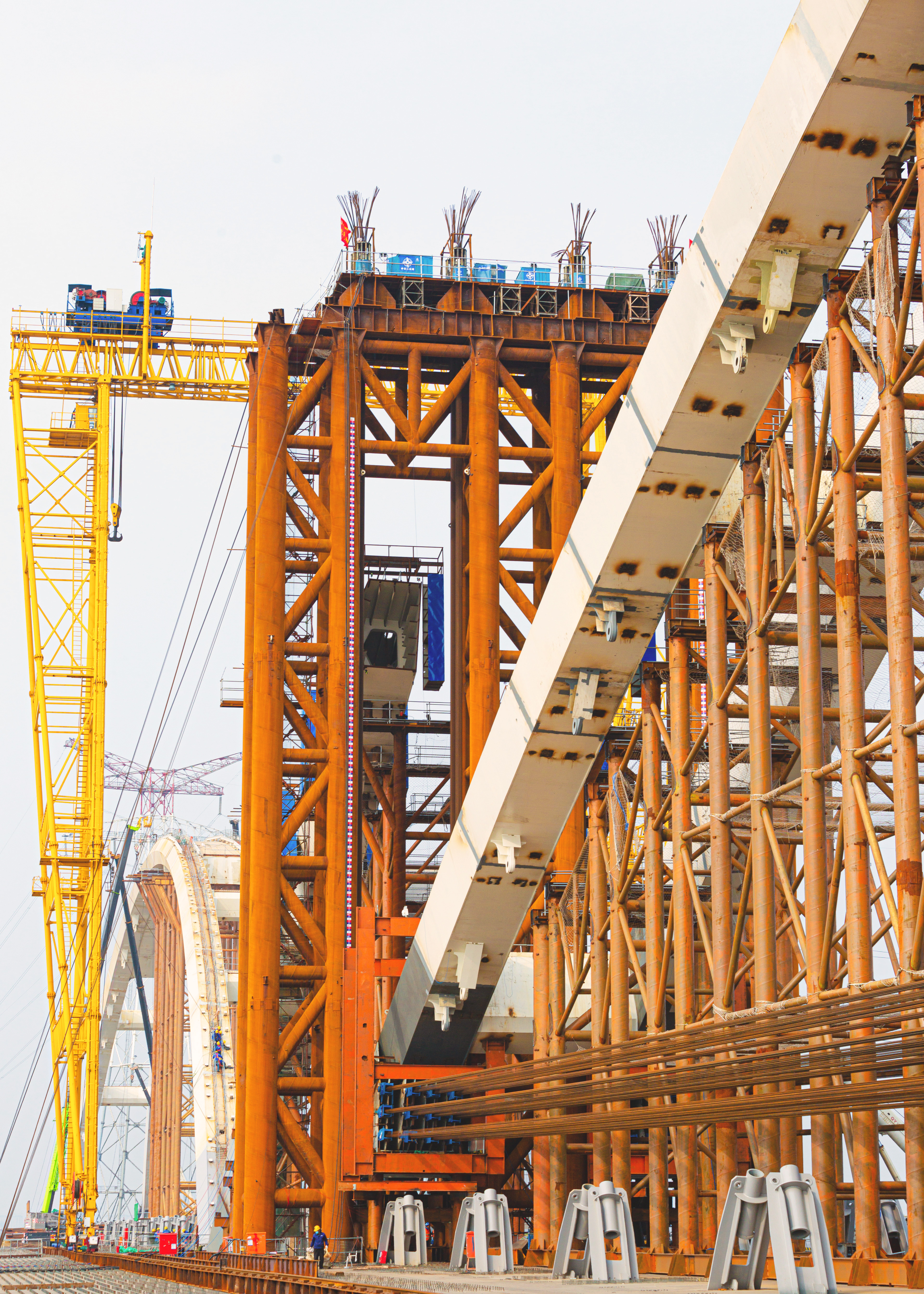 齊魯黃河大橋主跨420米拱肋提升是整個(gè)主橋施工難度最高、風(fēng)險(xiǎn)最大的關(guān)鍵節(jié)點(diǎn),其提升跨度為300米,提升重量達(dá)6800噸。在拱肋架設(shè)過程中,項(xiàng)目克服了超重構(gòu)件吊裝、拱肋節(jié)段安裝精度控制等重大難題,自主研發(fā)了120噸大規(guī)模龍門吊進(jìn)行超高拱肋節(jié)段架設(shè)作業(yè),并且項(xiàng)目引入了龍門吊運(yùn)行狀態(tài)在線監(jiān)測(cè)系統(tǒng),實(shí)時(shí)監(jiān)測(cè)門吊運(yùn)行狀態(tài),確保施工安全;研發(fā)設(shè)計(jì)的自動(dòng)化姿態(tài)調(diào)整吊具+三向千斤頂精調(diào)系統(tǒng),實(shí)現(xiàn)拱肋節(jié)段位置毫米級(jí)誤差安裝。