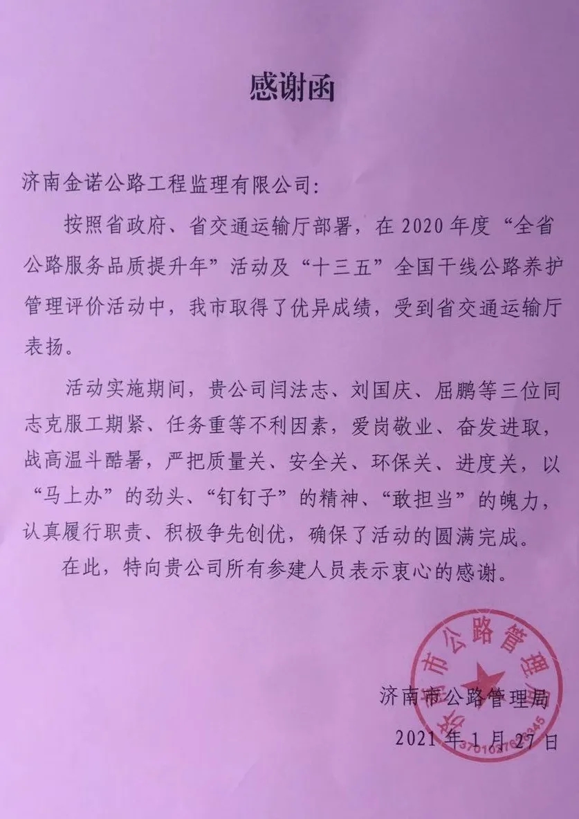 服務(wù)省會公路建設(shè)、展現(xiàn)金諾國企擔(dān)當(dāng), 濟(jì)南市公路管理局向金諾公司發(fā)來感謝函