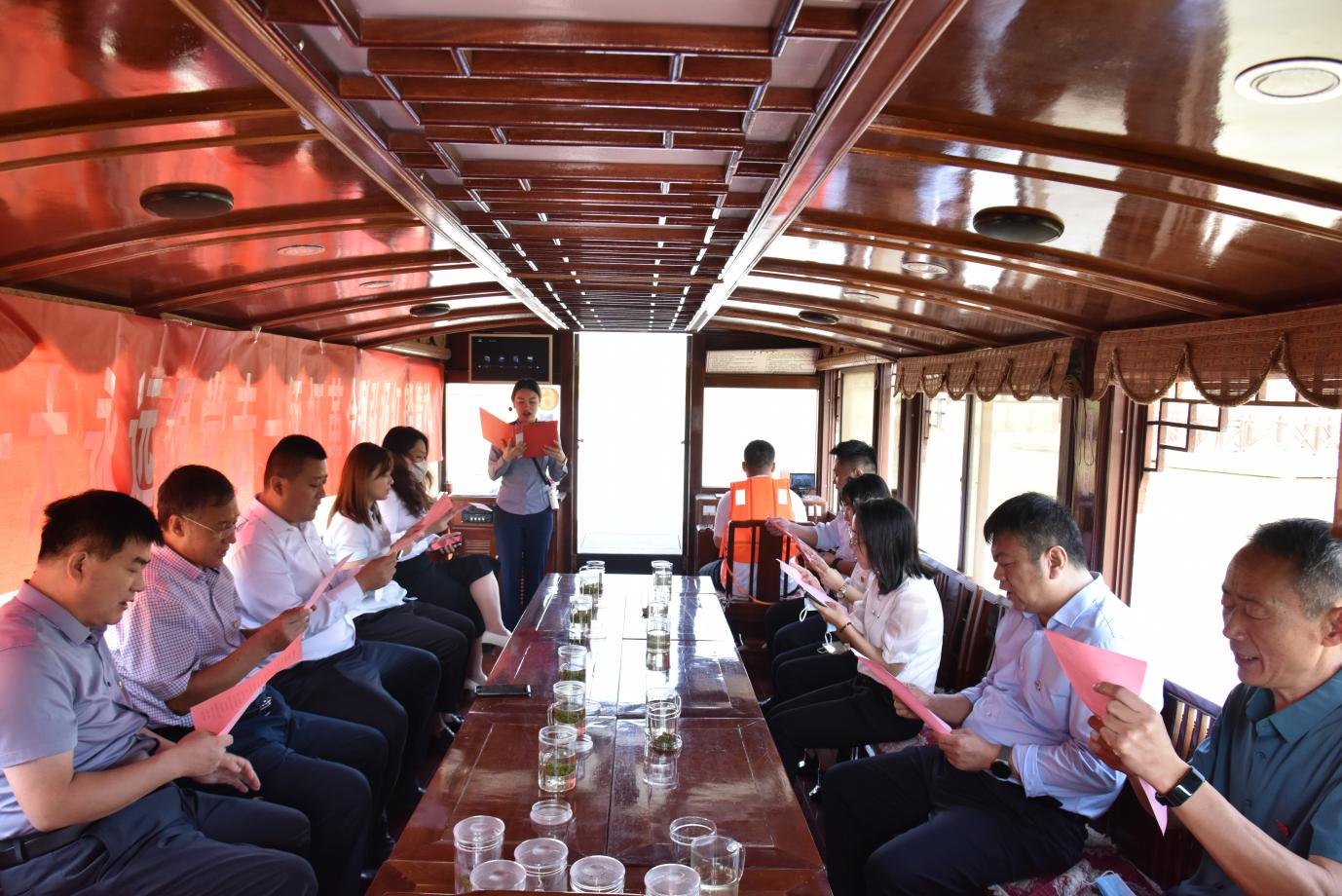 活動中,黨員干部模擬再現(xiàn)嘉興南湖紅船會議場景,圍繞“喜迎二十大 永遠跟黨走——緬懷革命先烈 弘揚紅船精神 ”主題開展朗誦活動。