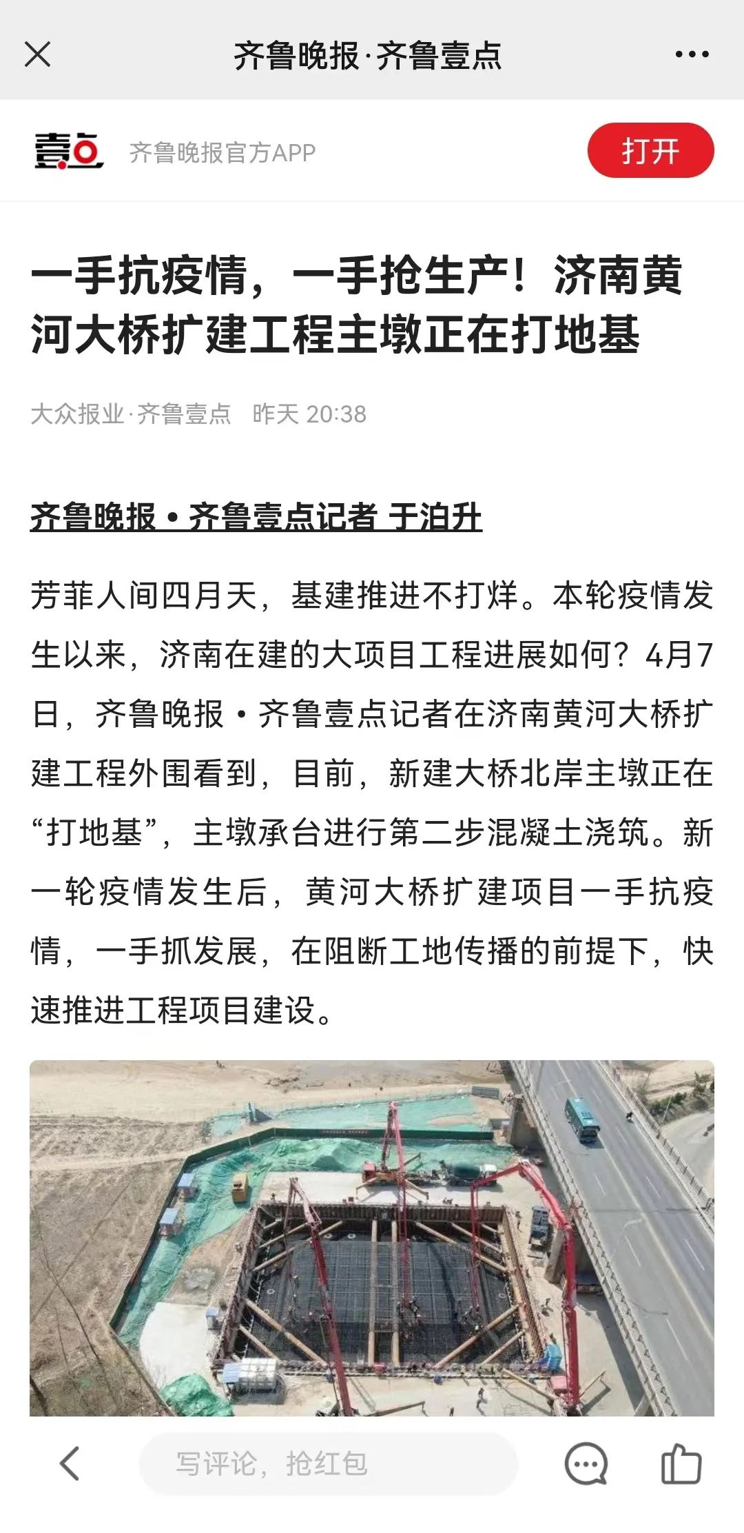 芳菲人間四月天,基建推進(jìn)不打烊。本輪疫情發(fā)生以來(lái),濟(jì)南在建的大項(xiàng)目工程進(jìn)展如何?4月7日,齊魯晚報(bào)•齊魯壹點(diǎn)記者在濟(jì)南黃河大橋擴(kuò)建工程外圍看到,目前,新建大橋北岸主墩正在“打地基”,主墩承臺(tái)進(jìn)行第二步混凝土澆筑。新一輪疫情發(fā)生后,黃河大橋擴(kuò)建項(xiàng)目一手抗疫情,一手抓發(fā)展,在阻斷工地傳播的前提下,快速推進(jìn)工程項(xiàng)目建設(shè)。