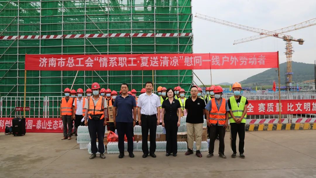 8月12日上午,濟(jì)南市總工會(huì)副主席申世平帶隊(duì)到中科院濟(jì)南科創(chuàng)城產(chǎn)業(yè)園項(xiàng)目現(xiàn)場(chǎng),為一線職工送去防暑降溫物品,慰問一線建設(shè)者,市總工會(huì)宣教部二級(jí)調(diào)研員張昭力,建設(shè)集團(tuán)黨委副書記鐘善良,集團(tuán)工會(huì)相關(guān)負(fù)責(zé)同志參加活動(dòng)。