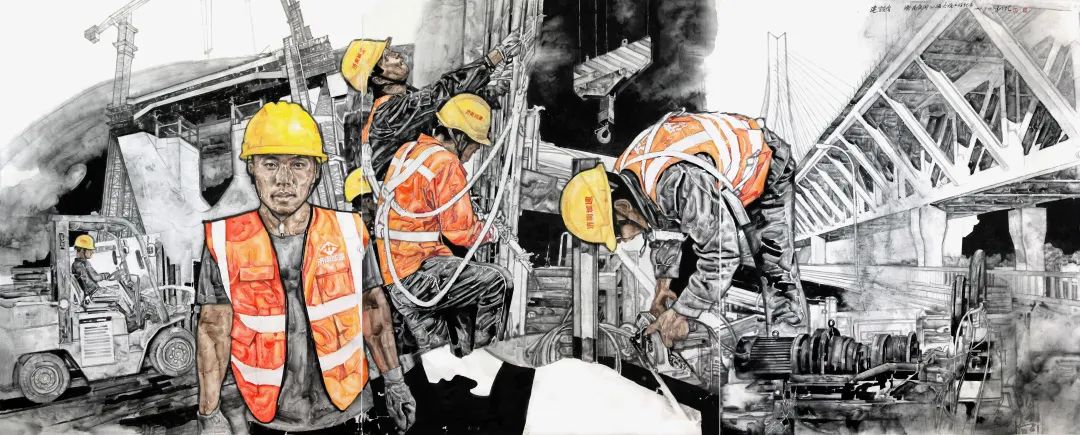 在此之前,李兆虬已經收集了很多工程建設方面的素材,“藝術最重要的是走心,注入情感”,李兆虬說:“在現場采風的過程中,看到聳立的橋墩、大型機械和施工的工人,物體的力量感和工人施工的力量感完美融合,作品的畫面油然而生。”經過20多天的創作,《建設者—濟南黃河公路大橋建設紀實》作品完美呈現。