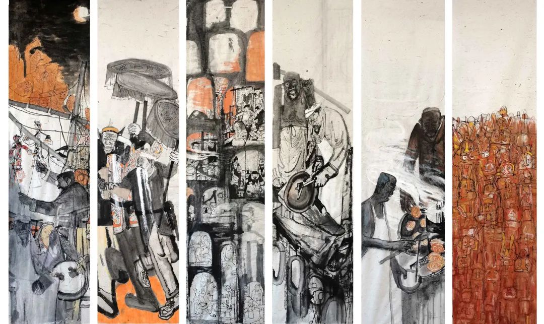 中國美術家協會會員、山東畫院簽約畫家、濟南市美術家協會理事何邦輝的《非遺系列》作品,展現了兔子王、濟南皮影、章丘鐵匠、龍山黑陶、油旋甜沫、鼓子秧歌等6種濟南非物質文化遺產。