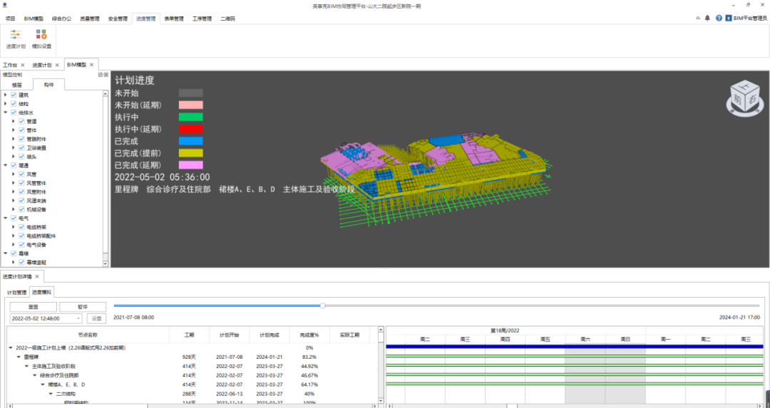 結(jié)合項(xiàng)目結(jié)構(gòu)超限設(shè)計(jì)的實(shí)際,為從根本上解決因后澆帶設(shè)置過多而產(chǎn)生的進(jìn)度、質(zhì)量、安全文明問題,論證實(shí)施了“跳倉法”施工工藝,按“塊料規(guī)劃、塊料施工、分層澆注、整體成型”的原則施工,加大資源調(diào)配力度,在節(jié)約工期的同時(shí),實(shí)現(xiàn)文明施工、質(zhì)量控制、進(jìn)度管理有益結(jié)合。深入推進(jìn)BIM全過程管理應(yīng)用,實(shí)現(xiàn)以BIM模型為基礎(chǔ)的三維圖紙審查、碰撞檢測、凈高分析、設(shè)計(jì)方案比選、施工模型深化、管線綜合、進(jìn)度模擬、數(shù)據(jù)共享等功能,為施工方案編制論證、進(jìn)度檢查反饋、圖紙審查評價(jià)等多方面提供了多維度的強(qiáng)大支持。