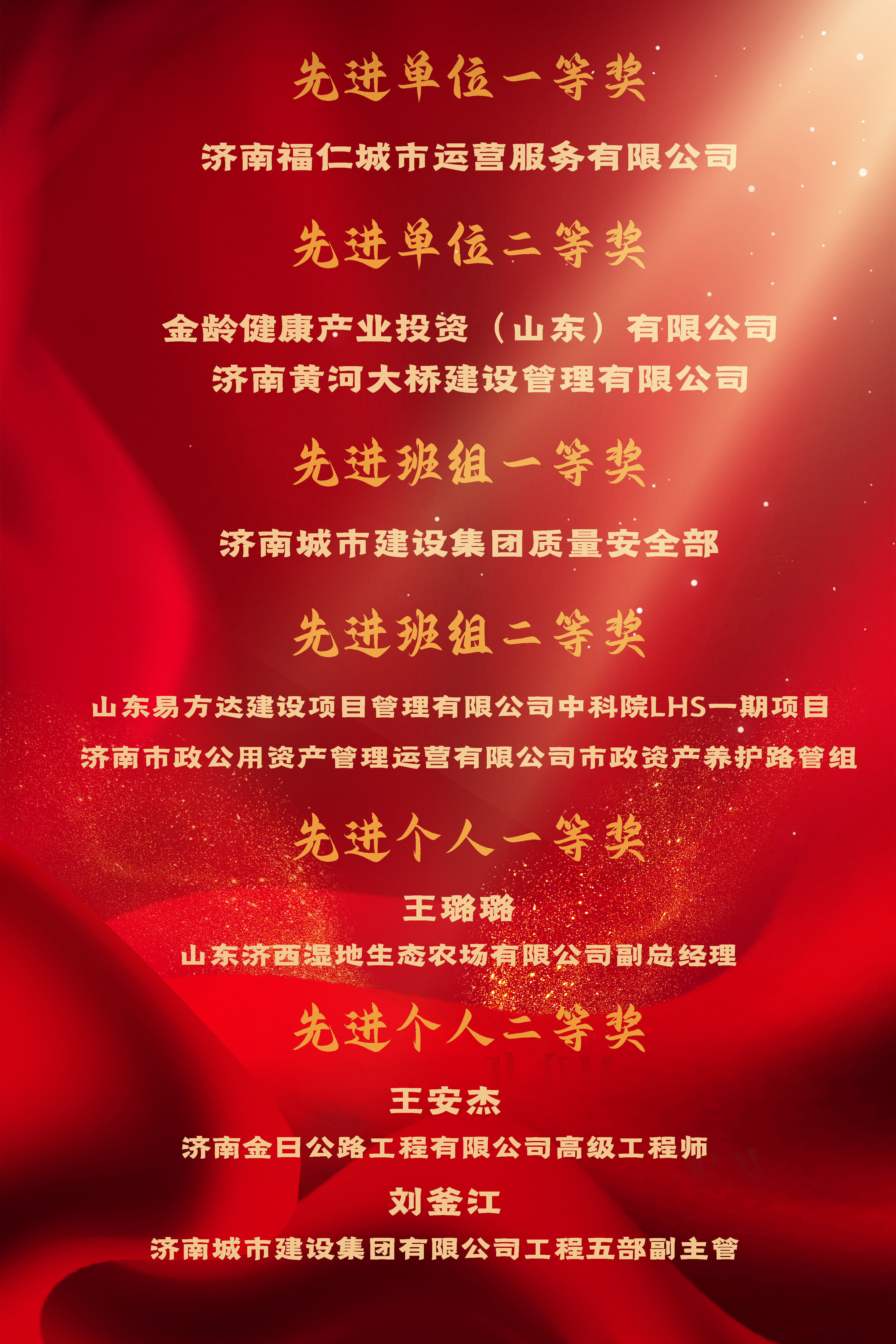 會上宣讀了《關(guān)于表揚2022年建設(shè)強省會勞動競賽先進集體和先進個人的通報》,獲得勞動競賽一等獎的30個單位獲頒濟南市五一勞動獎狀、30個班組獲頒濟南市工人先鋒號、80名職工獲頒濟南市五一勞動獎?wù)隆F渲?,建設(shè)集團3家公司獲先進單位稱號,3個班組獲先進班組稱號,3名同志獲先進個人稱號。