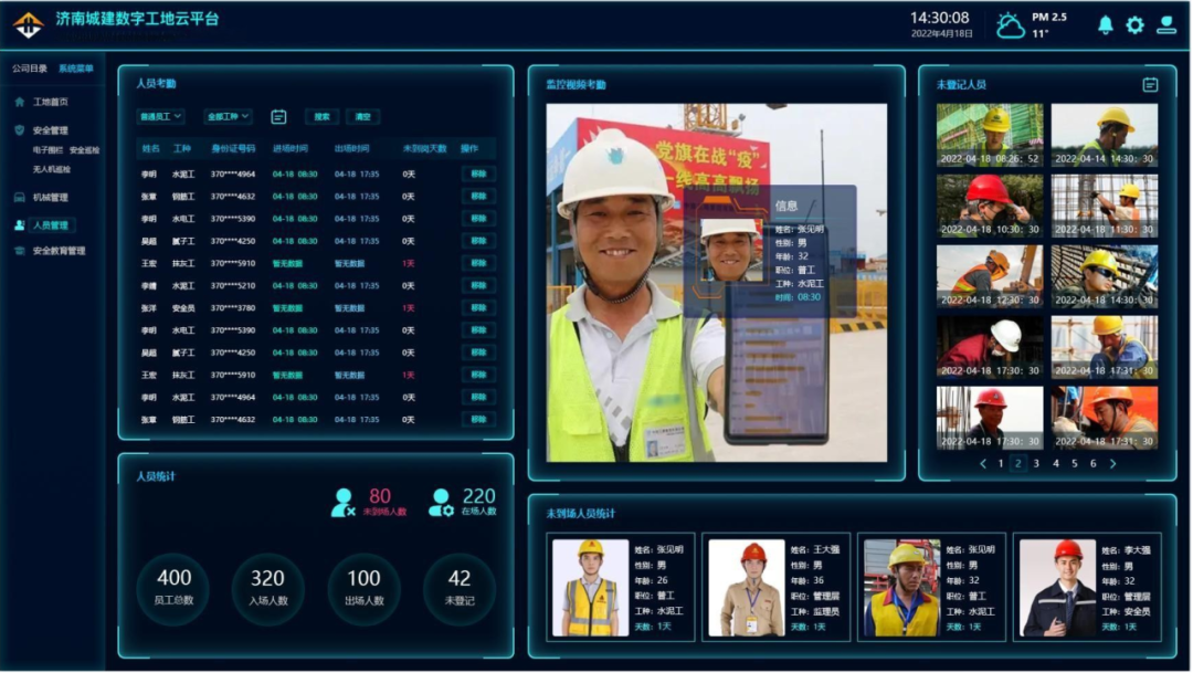 人員管理實(shí)現(xiàn)優(yōu)化,G104京嵐線濟(jì)南黃河公路大橋擴(kuò)建工程項(xiàng)目應(yīng)用智能化勞務(wù)人員管理系統(tǒng),系統(tǒng)根據(jù)視頻采樣,可以實(shí)時定位,統(tǒng)計(jì)當(dāng)日出勤人數(shù),能夠針對不系安全帶、不正確佩戴安全防護(hù)用品,違章動火作業(yè)等進(jìn)行智能識別,并抓拍報警。系統(tǒng)累計(jì)保障工地安全620天,累計(jì)錄入工人800余人,攝像頭安裝17個,避免了火災(zāi),機(jī)械違規(guī)載人,安全用品佩戴不規(guī)范,防護(hù)缺失等隱患發(fā)生。