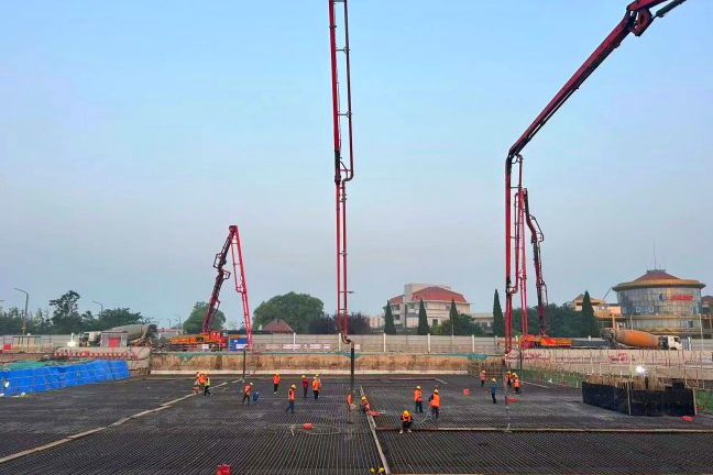 本次澆筑從9月6日22時(shí)開(kāi)始,歷時(shí)30小時(shí),4臺(tái)泵車(chē)聯(lián)合作戰(zhàn),順利澆筑完成3800立方米混凝土。為完成施工區(qū)域道路導(dǎo)改及管線遷改,臨八路人防頂板先行施工,人防蓋板由鋼管柱支撐,長(zhǎng)度49米,寬度73.5米,蓋板下主體結(jié)構(gòu)及土方施工采用蓋挖法施工,結(jié)構(gòu)主體采用C45P8抗?jié)B混凝土。