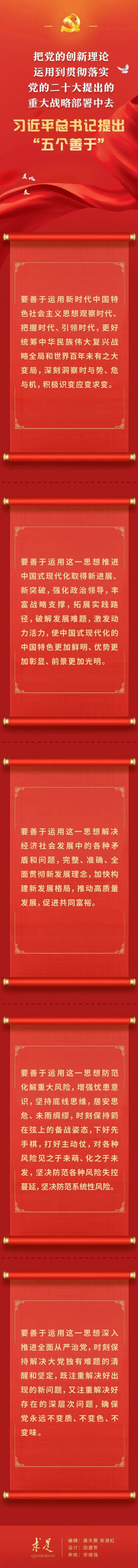 如何把黨的創(chuàng)新理論運(yùn)用到貫徹落實(shí)黨的二十大提出的重大戰(zhàn)略部署中去?在2023年第10期《求是》雜志刊發(fā)的習(xí)近平總書記重要文章《在二十屆中央政治局第四次集體學(xué)習(xí)時(shí)的講話》中,總書記提出“五個(gè)善于”的明確要求。