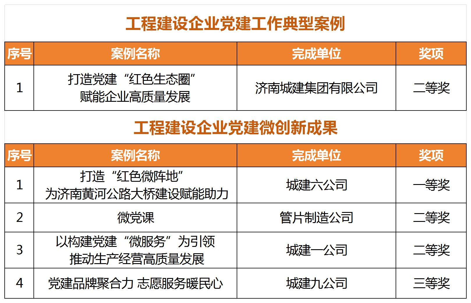 近日,中國施工企業(yè)管理協(xié)會(huì)發(fā)布了《關(guān)于推廣2024年工程建設(shè)企業(yè)黨建工作優(yōu)秀成果的通知》,建設(shè)集團(tuán)所屬濟(jì)南城建集團(tuán)公司《打造黨建“紅色生態(tài)圈” 賦能企業(yè)高質(zhì)量發(fā)展》黨建工作案例獲評(píng)“工程建設(shè)企業(yè)黨建工作典型案例”二等獎(jiǎng),城建六公司《打造“紅色微陣地 ” 為濟(jì)南黃河公路大橋建設(shè)賦能助力》、城建一公司《以構(gòu)建黨建“微服務(wù)”為引領(lǐng) 推動(dòng)生產(chǎn)經(jīng)營高質(zhì)量發(fā)展》等4項(xiàng)案例分別獲評(píng)“工程建設(shè)企業(yè)黨建工作微創(chuàng)新成果”一、二、三等獎(jiǎng)。