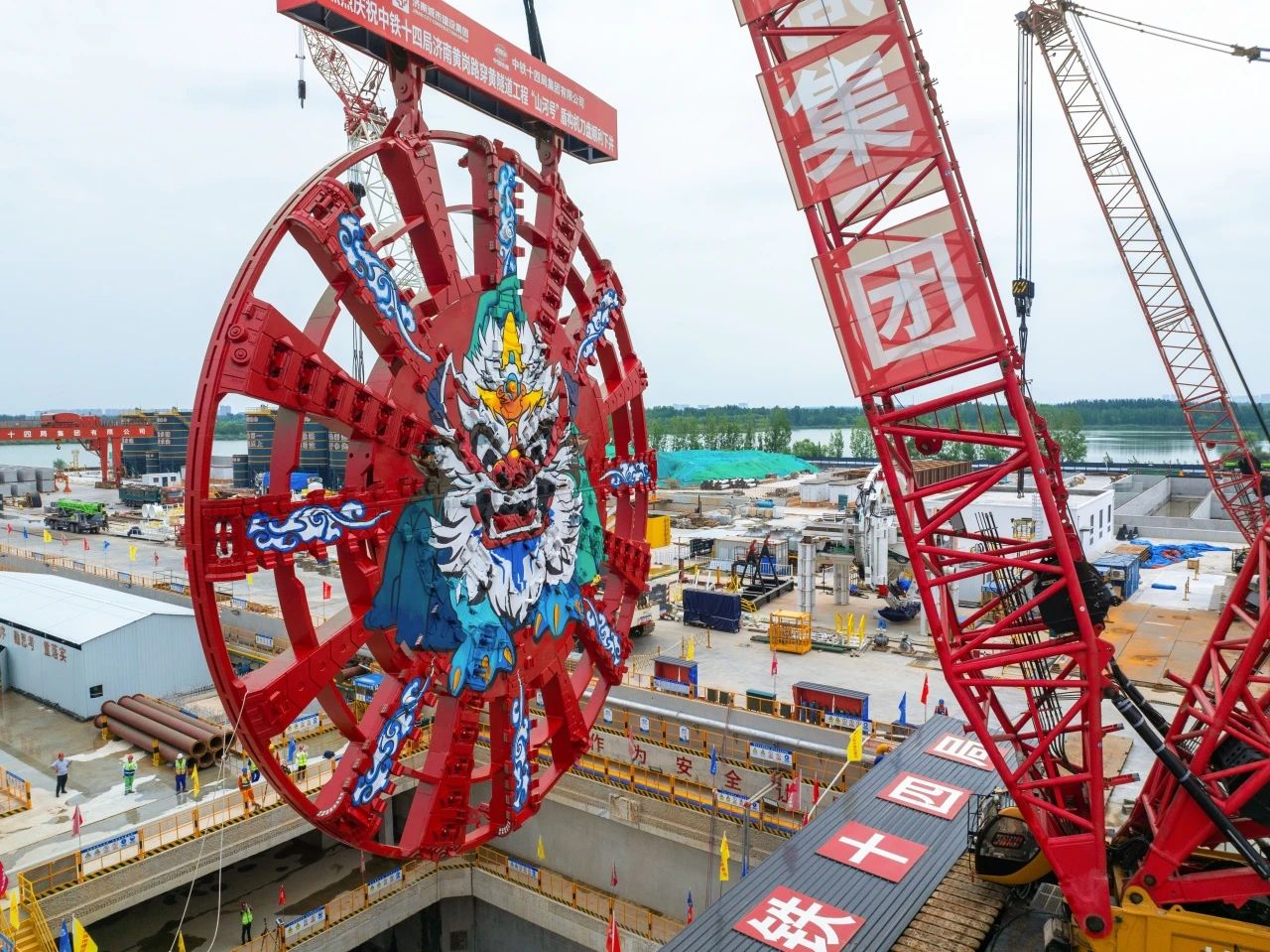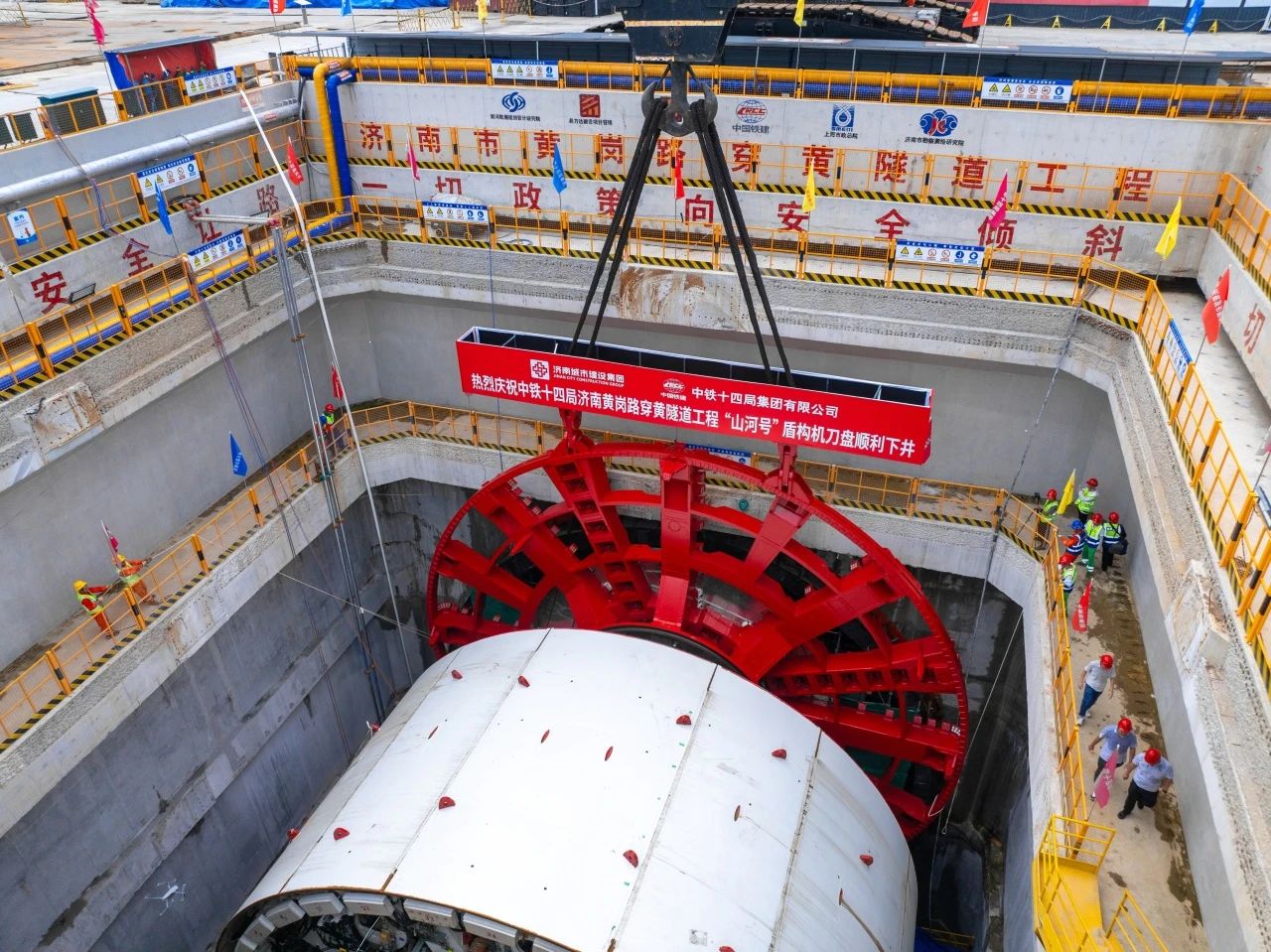 自今年5月19日“山河號(hào)”盾構(gòu)機(jī)在濟(jì)南驗(yàn)收下線后,歷時(shí)3天完成拆解;5月24日,盾構(gòu)機(jī)首塊順利運(yùn)輸至濟(jì)南市黃崗路穿黃隧道施工現(xiàn)場(chǎng);5月27日,直徑9.5米、重達(dá)195噸的刀盤中心塊也順利抵達(dá);6月11日,重510噸,長約30米的盾構(gòu)機(jī)首件——一號(hào)臺(tái)車成功吊裝下井,正式拉開世界最大直徑泥水平衡盾構(gòu)機(jī)下井組裝的序幕;7月12日,盾構(gòu)機(jī)主驅(qū)動(dòng)及四號(hào)臺(tái)車同時(shí)順利下井。