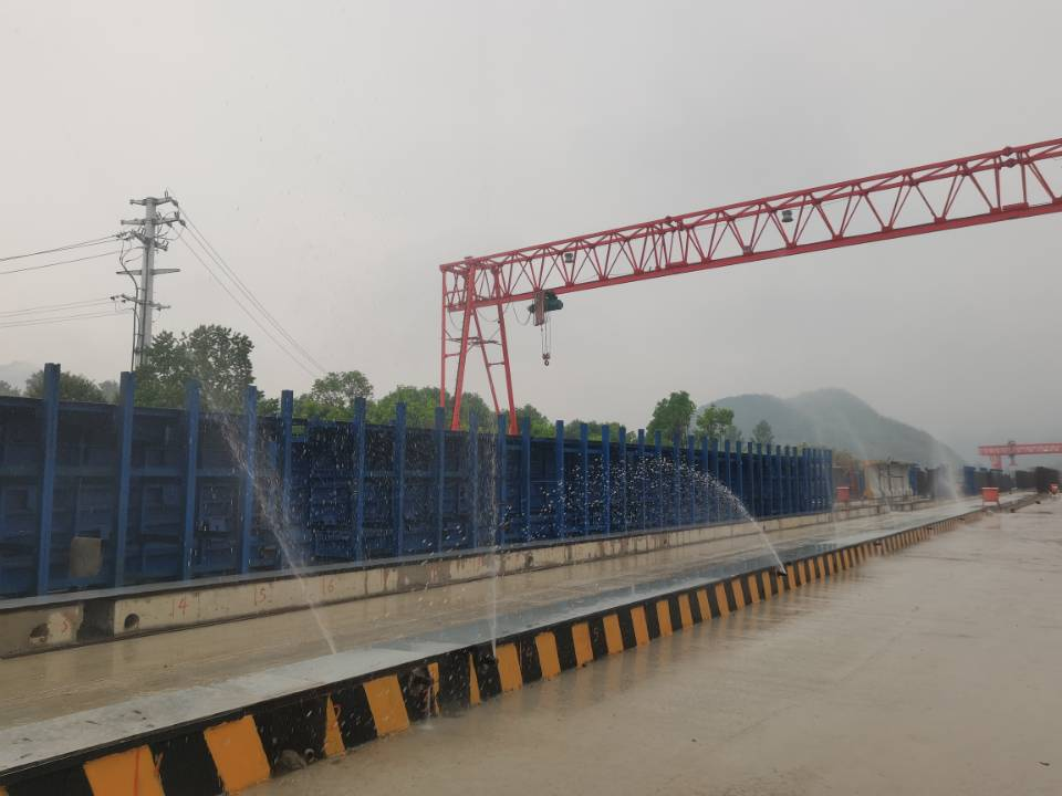 該系統(tǒng)在梁場建設(shè)時(shí)提前在臺(tái)座中預(yù)埋噴淋管道,管道與自動(dòng)供儲(chǔ)水后臺(tái)相連通。當(dāng)T梁模板拆除后,可通過手機(jī)APP控制噴淋系統(tǒng)對T梁的腹板和翼板進(jìn)行全面均勻噴灑,確保T梁養(yǎng)護(hù)無死角,同時(shí)通過手機(jī)應(yīng)用控制養(yǎng)護(hù)操作,隨時(shí)隨地一鍵啟動(dòng)或關(guān)閉,必要時(shí)選擇自動(dòng)化模式,實(shí)現(xiàn)T梁24小時(shí)不間斷養(yǎng)護(hù)。