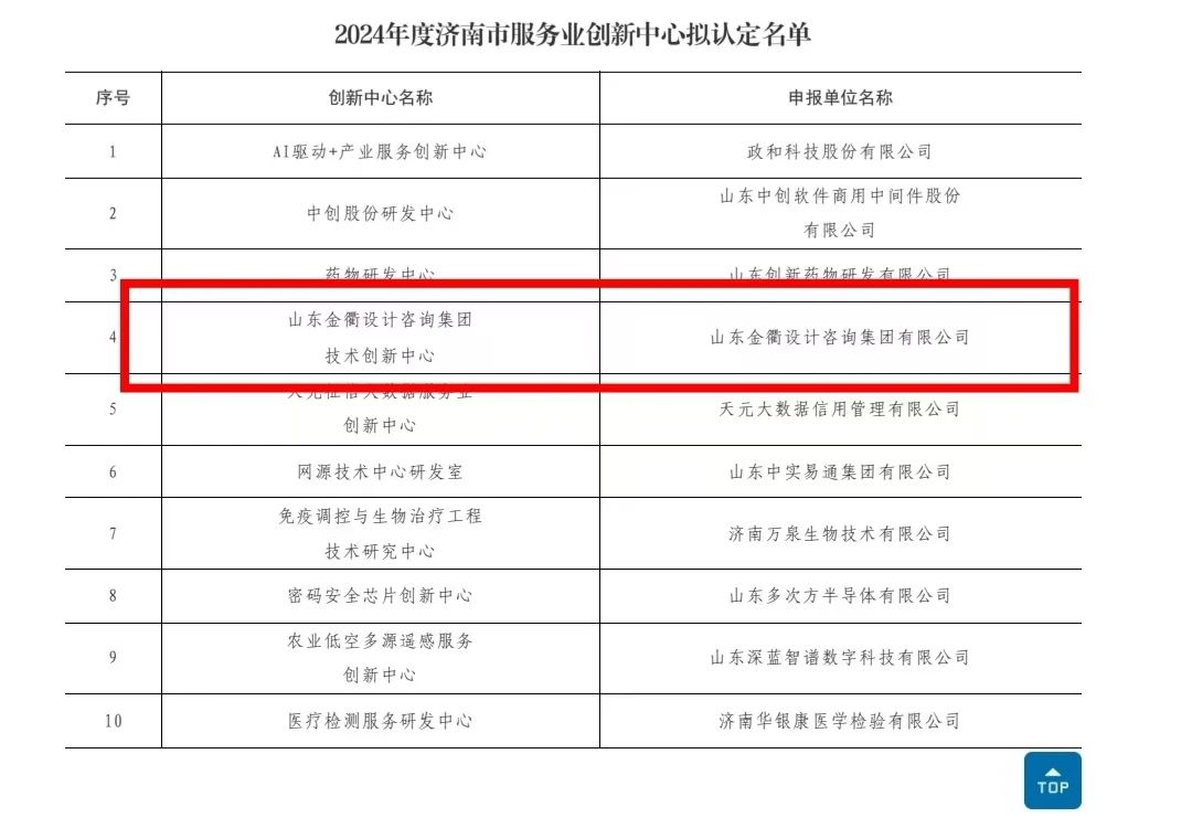 近日,濟(jì)南市發(fā)展和改革委員會(huì)公示《2024年度濟(jì)南市服務(wù)業(yè)創(chuàng)新中心擬認(rèn)定名單》,建設(shè)集團(tuán)所屬山東金衢設(shè)計(jì)咨詢集團(tuán)有限公司技術(shù)創(chuàng)新中心獲批2024年度濟(jì)南市服務(wù)業(yè)創(chuàng)新中心。