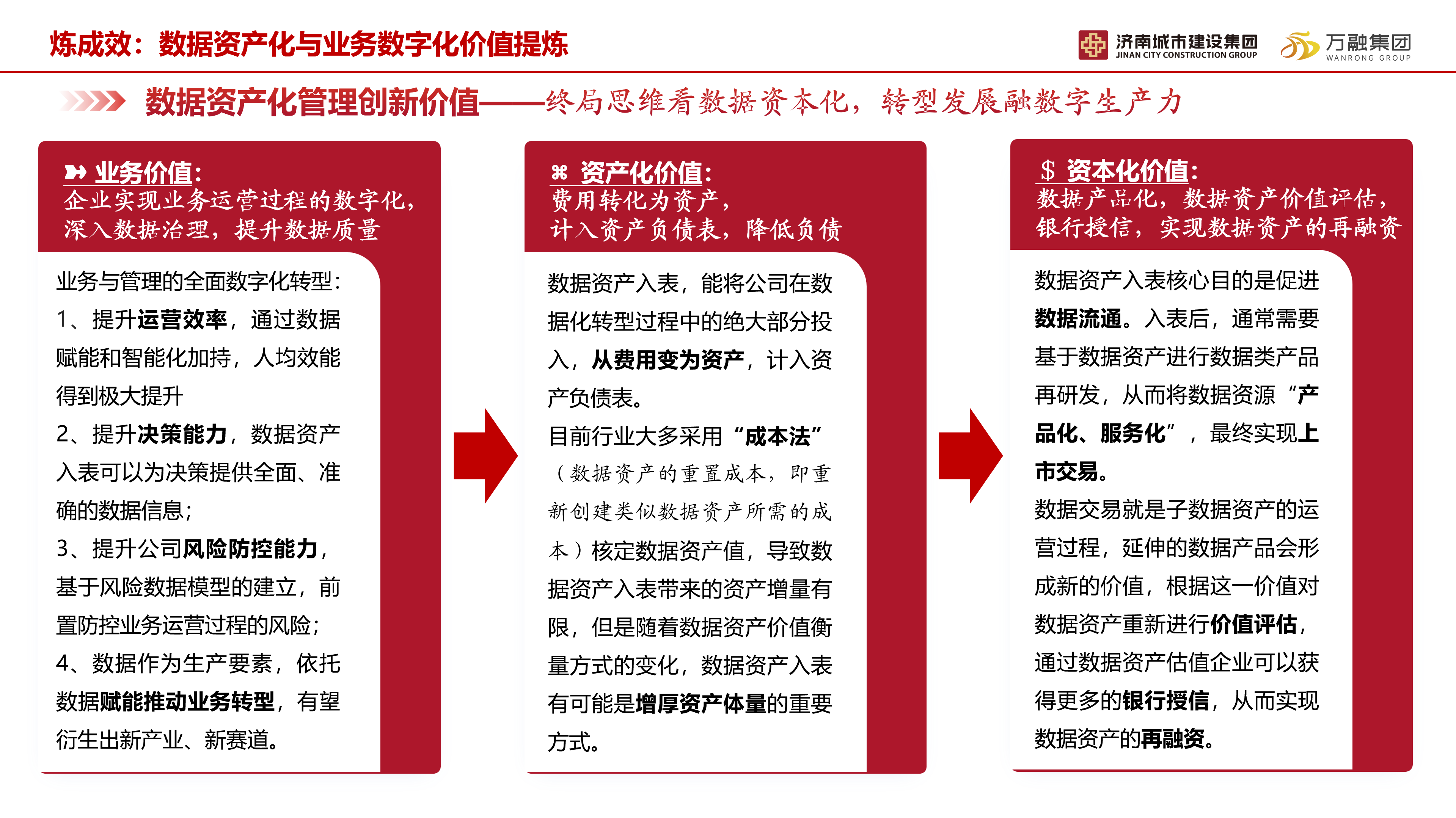 萬融集團高度重視數(shù)據(jù)資產(chǎn)的運營管理和價值創(chuàng)造,通過持續(xù)加強政策研究、行業(yè)交流,開展相關(guān)理論和實踐探索,明確了數(shù)據(jù)資源化、資產(chǎn)化、產(chǎn)品化實施路徑。同時,基于自身數(shù)據(jù)治理的實踐經(jīng)驗,積極參與濟南城市建設(shè)集團高質(zhì)量發(fā)展管理創(chuàng)新案例評審、“技能興魯”職業(yè)技能大賽等典型應(yīng)用案例和創(chuàng)新場景應(yīng)用,進一步構(gòu)建數(shù)據(jù)資產(chǎn)價值體系,數(shù)據(jù)賦能經(jīng)營管理提升。