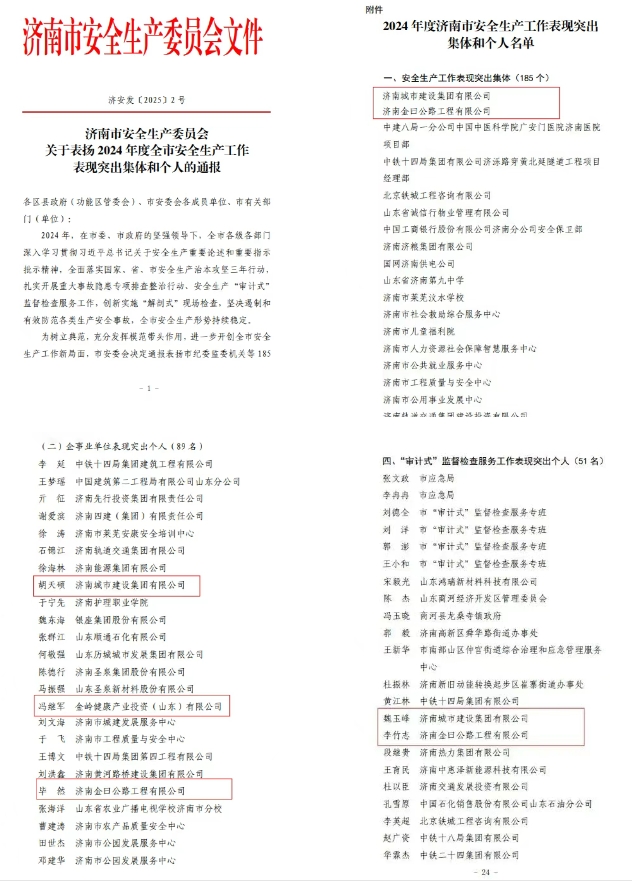 近日,濟(jì)南市安全生產(chǎn)委員會(huì)印發(fā)《關(guān)于表?yè)P(yáng)2024年度全市安全生產(chǎn)工作表現(xiàn)突出集體和個(gè)人的通報(bào)》,濟(jì)南城市建設(shè)集團(tuán)及集團(tuán)所屬山東金曰交通發(fā)展集團(tuán)被評(píng)為安全生產(chǎn)工作表現(xiàn)突出集體,3名同志被評(píng)為安全生產(chǎn)工作表現(xiàn)突出個(gè)人,2名同志被評(píng)為“審計(jì)式”監(jiān)督檢查服務(wù)工作表現(xiàn)突出個(gè)人。