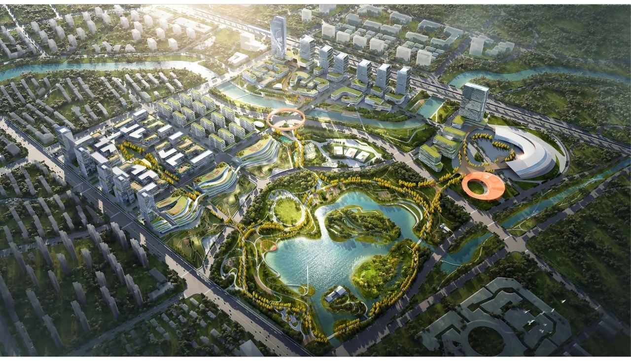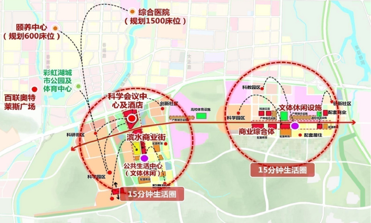 本區(qū)域配套設(shè)施完善,統(tǒng)籌共享城市級(jí)醫(yī)療、文體及商業(yè)設(shè)施。以科創(chuàng)城為中心,兩公里范圍內(nèi)規(guī)劃建設(shè)有1500床位的綜合醫(yī)院、600床位的頤養(yǎng)中心、占地40公頃的彩虹湖城市公園以及建筑面積10萬(wàn)平方米的奧特萊斯商業(yè)綜合體等??苿?chuàng)城內(nèi)部結(jié)合景觀水系,規(guī)劃建設(shè)共享服務(wù)帶,集中設(shè)置眾創(chuàng)平臺(tái)、文體活動(dòng)中心、餐飲商業(yè)、社區(qū)醫(yī)院等,并同步規(guī)劃建設(shè)可容納2000人的會(huì)議中心和1000客房的國(guó)際酒店。