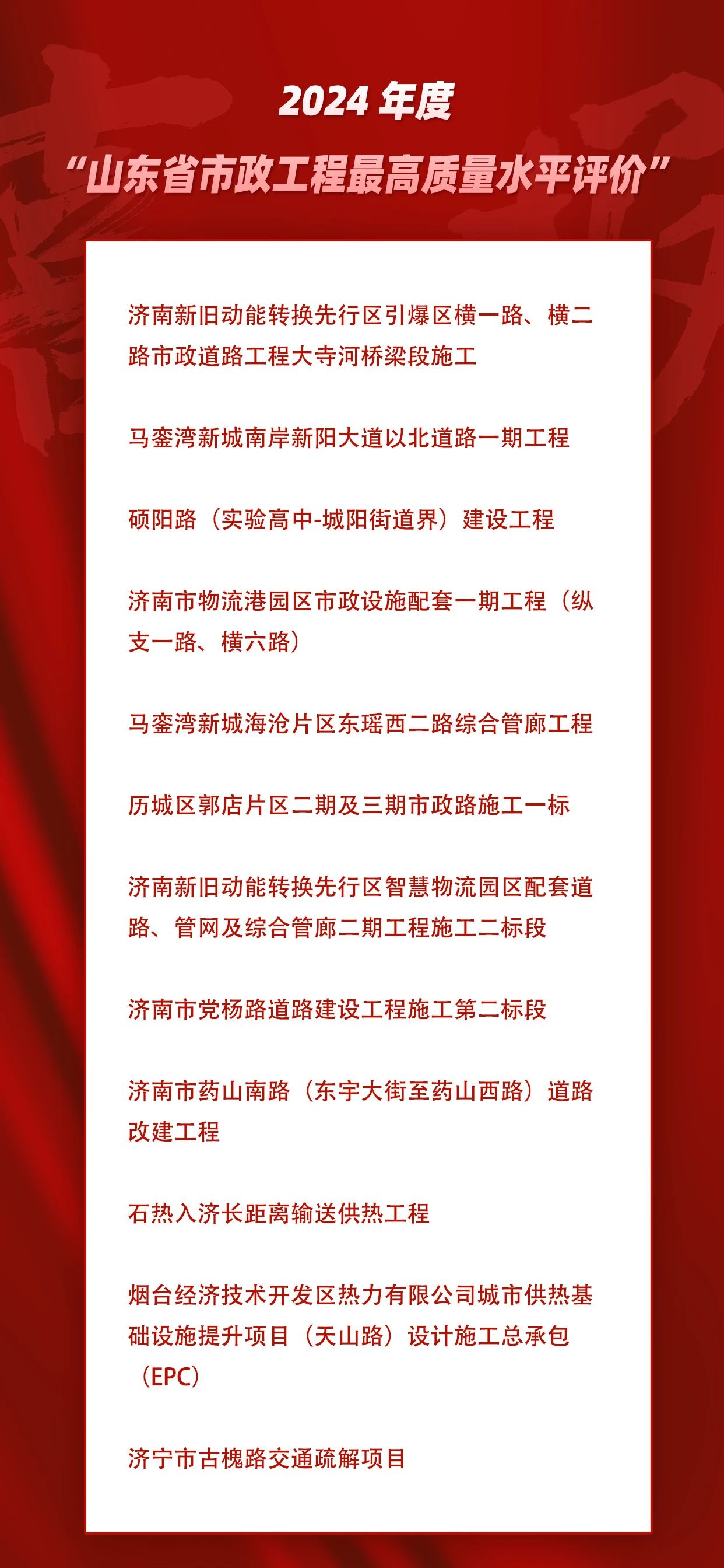 近日,山東省市政行業(yè)協(xié)會發(fā)布了《關(guān)于公布2024年度通過市政工程最高質(zhì)量水平評價工程的通知》,建設(shè)集團(tuán)及其所屬子公司參與的12項工程獲評2024年度山東省市政工程最高質(zhì)量水平評價。